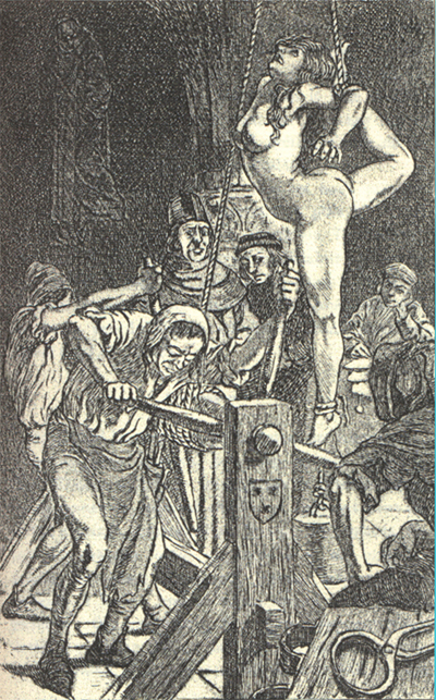 Ilustracja przesłuchania podejrzanej o czarownictwo. Grafika autorstwa Martina van Maële prezentuje wariant tortur metodą "wahadło"