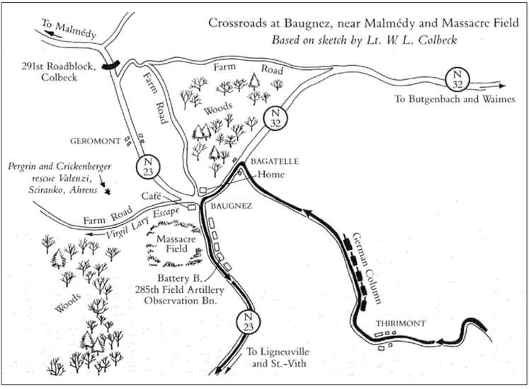 Trasa amerykańskiego konwoju wiodła przez niemieckie miasteczka Rott i Raere, a następnie przez belgijskie miasteczka Eynatten, Eupen i Malmedy. W tym ostatnim miasteczku dowódca konwoju został ostrzeżony o niebezpieczeństwie natknięcia się na silną niemiecką grupę pancerną, doradzano mu objazd jednak ten zbagatelizował uwagi i zdecydował się podążać trasą wyznaczoną przez grupę rekonesansową dowodzoną przez porucznika Virgila Lary’ego. Około godziny 12:45 dotarli do skrzyżowania dróg N23 i N32 na południowy wschód od Malmedy, konwój skierował się w kierunku St. Vith, gdzie po niespełna pięciuset metrach znaleźli się pod ostrzałem niemieckich czołgów PzKpfw IV stanowiących szpicę Grupy Bojowej Peipera.